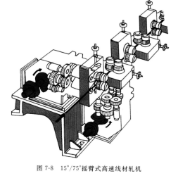 德馬克無(wú)扭高速線材軋機(jī)與摩根軋機(jī)一樣,采用偏心套式的輥縫調(diào)整機(jī)構(gòu)和外齒傳動(dòng),則在調(diào)整輥縫時(shí)必然引起軋輥軸齒輪嚙合中心發(fā)生變化?颂敳垯C(jī)為了克服軋輥軸齒輪嚙合中心變化的缺點(diǎn),在采用偏心套式輯縫調(diào)整機(jī)構(gòu)的同時(shí),采用了內(nèi)齒輪傳動(dòng)。而目采用偏心套式輥縫調(diào)整機(jī)構(gòu)在結(jié)構(gòu) 上縮小了軋輥軸的軸頸直徑,從而限制了精軋的能力。實(shí)踐證明,偏心套座孔由于長(zhǎng)期的脈動(dòng)載荷作用而易于磨損,致使配合松動(dòng),引起沖擊和扭振,高速時(shí)更甚。為此,德馬克公司設(shè)計(jì)了一套搖臂式調(diào)整輥縫的高速線材軋機(jī),如圖7-7 所示。軋機(jī)的布置形式有兩種∶一種與摩根式的相仿,各相鄰機(jī)架間互相成 90°角布置,且各自與水平面交替上下成45°角;另一種布置形式是各相鄰機(jī)架間仍然互相成 90°角布置,但各自與水平面交替上下成 15°/75°角,如圖7-8 所示。軋機(jī)的增速箱與分速箱結(jié)合起來(lái),在一個(gè)箱殼里。