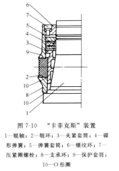 ⑧自 20世紀(jì)80 年代以來(lái),采用了專門設(shè)計(jì)的被稱為"卡菲克斯"的新型輥環(huán)緊固裝置,如圖 7-10 所示。它與標(biāo)準(zhǔn)的輥環(huán)緊固裝置相比較,使碳化鎢輥環(huán)軋槽壽命從4 000t/mm 直徑提高到9000~11000t/mm 直徑,軋輥輥環(huán)更換的時(shí)間間隙大大增加了。