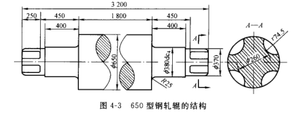 650型鋼軋輥的結構如圖4-3所示,型鋼軋輥的輥身上有軋槽,軋槽又成為孔型?仔驮谳伾砩系陌才艡C尺寸取決于型鋼軋制工藝要求,輥徑兩端的梅花斷面的輥頭,已傳遞扭矩。輥徑安裝在軸承中,并通過軸承座和壓下裝置吧軋制力傳給機架。