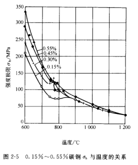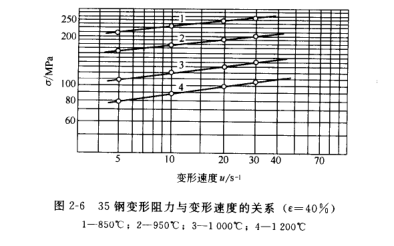 (2)變形溫度的影響 溫度是對(duì)變形阻力影響較大的一個(gè)因素,他隨變形溫度的升高,各種金屬和合金所有的強(qiáng)度指標(biāo)(屈服極限,強(qiáng)度極限和硬度等)均降低。有圖2-5可知,隨著變形溫度升高,不同金屬或合金變形阻力之間差別縮小,在高溫下,含碳量對(duì)變形阻力影響不小。