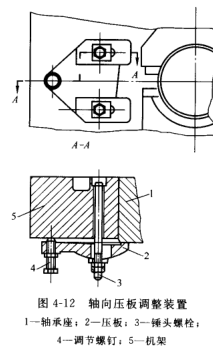 圖4-7所示中,裝有軸向壓板12,13,14,其作用為對正軋槽,固定軋輥的軸向位置,承受軸向力以及在止推襯瓦磨損時軸向移動軸承座。軸向壓板調(diào)整裝置如圖4-12所示,壓板2通過其橢圓孔套在穿過機架立柱通孔的錘頭螺栓3上,旋轉(zhuǎn)調(diào)節(jié)螺釘4,可使用壓板壓緊(或松開)軸承座。在換輥時,將錘頭螺栓的螺母松開后,壓板可沿其橢圓孔向外移開,這種機構(gòu)只能單方向(向內(nèi))軸向移動軋輥,一次,必須在每個軋輥的兩端成對設(shè)置。當欲使一端的壓板向內(nèi)調(diào)整時,另一端的壓板必須松開,從而使軋輥軸向固定。這種結(jié)構(gòu)比較簡單,便于換輥操作。