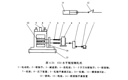 650水平輾型鋼軋機如圖 4-24所示。主要由主傳動裝置、機架、機架換移裝置、壓下裝置、軋輥平衡裝置、軌座等組成。